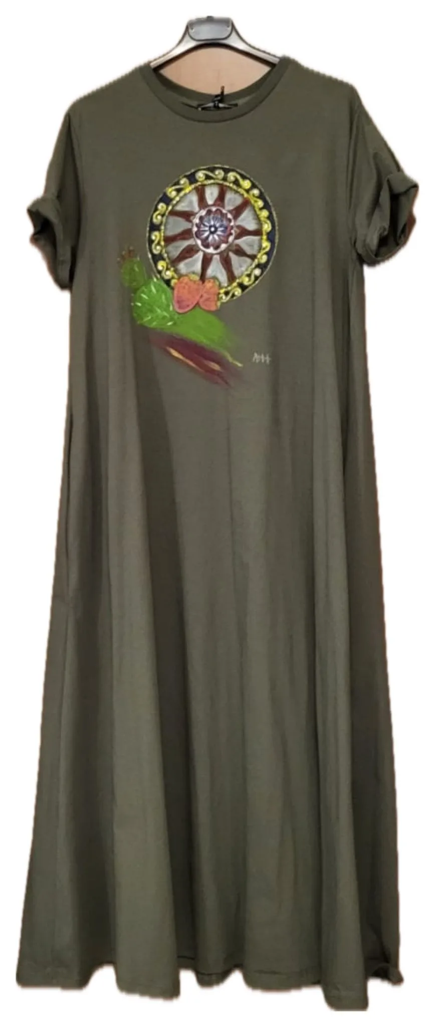 Abito lungo in cotone color verde militare – soggetto Fichi d’India sul davanti – dipinto a mano