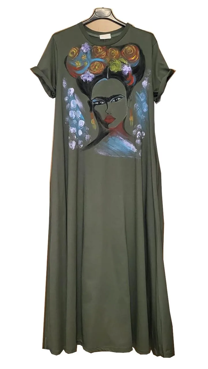 Abito lungo in cotone color verde militare – soggetto Fida Kahlo sul davanti – dipinto a mano