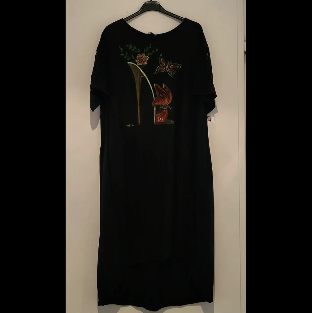 Abito lungo in lino e cotone nero – soggetto scarpa a spillo stilizzata e fiori sul davanti dipinta a mano