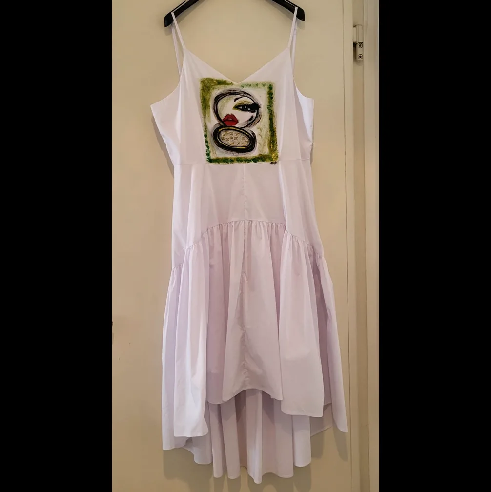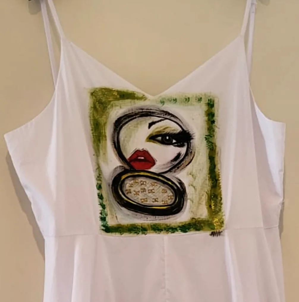 Abito spalline in cotone bianco – soggetto occhio di donna allo specchietto trousse con spugnetta logata dipinta a mano