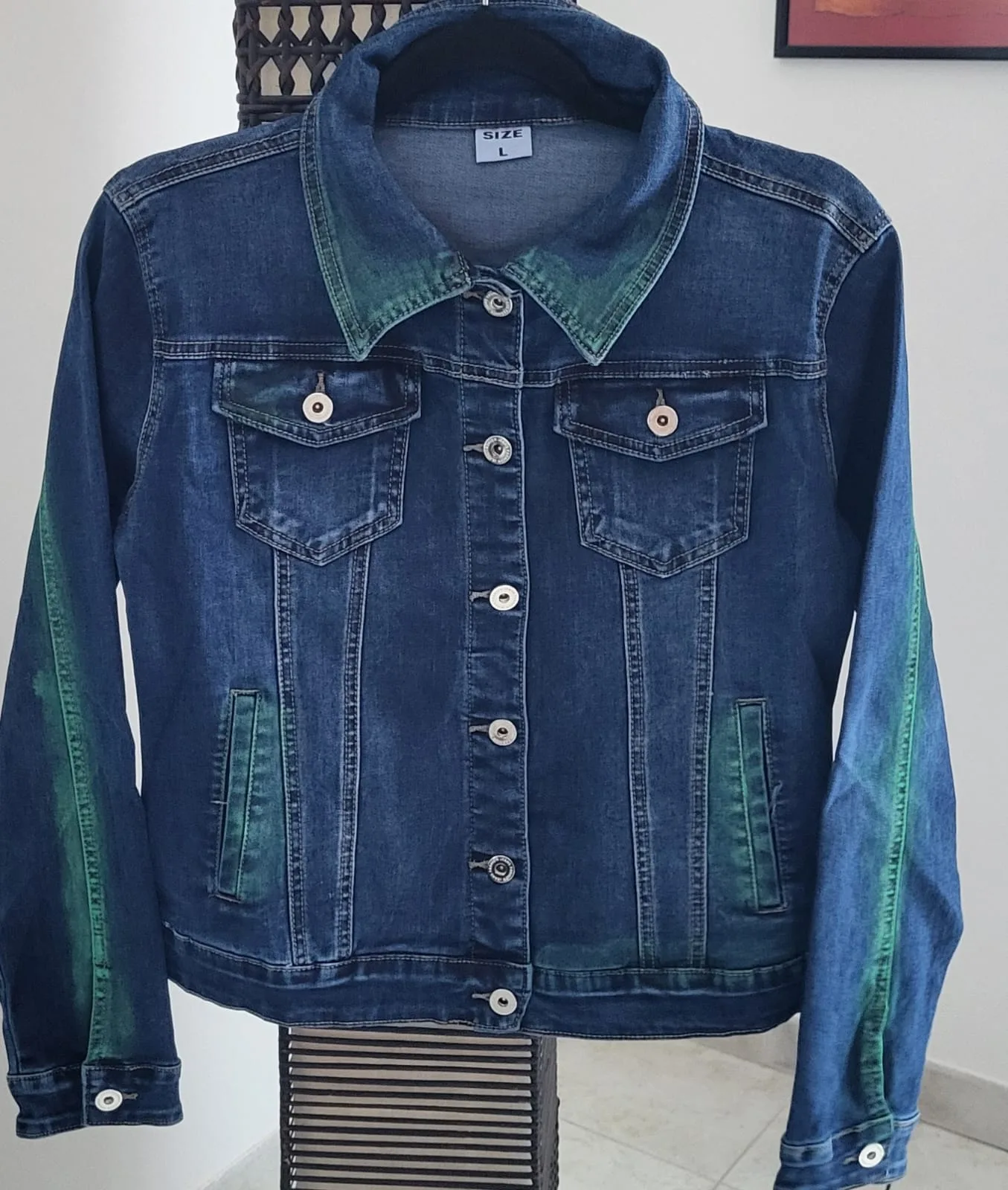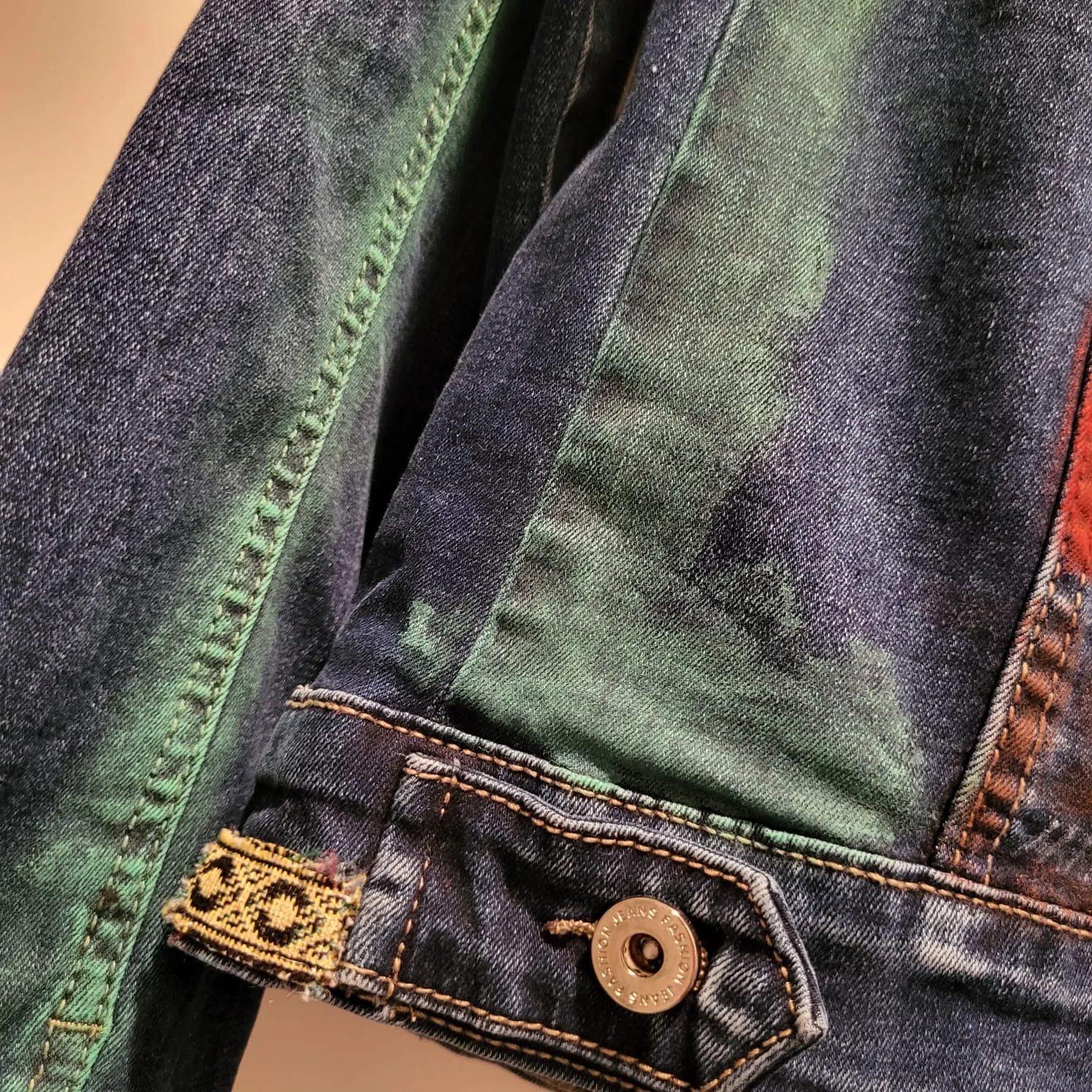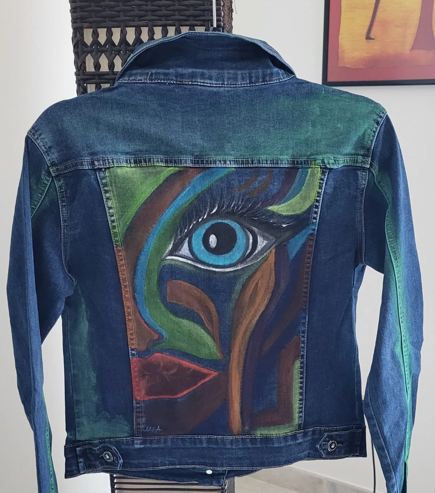 Giubbino in jeans tessuto Denim elasticizzato con soggetto occhio astratto dipinto a mano sulla parte dietro stile Pop Art