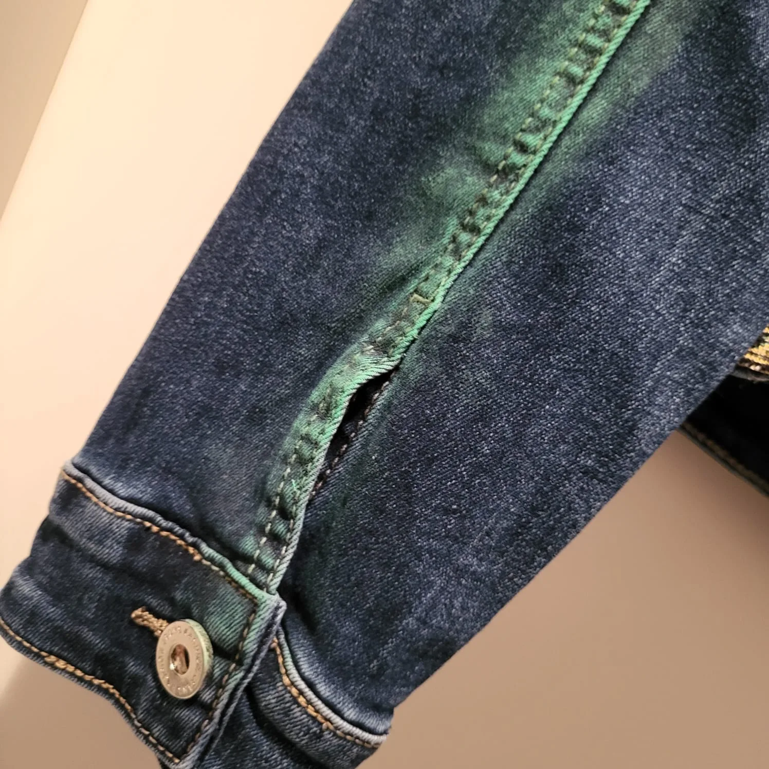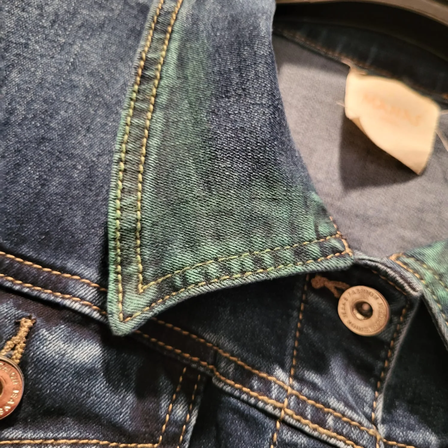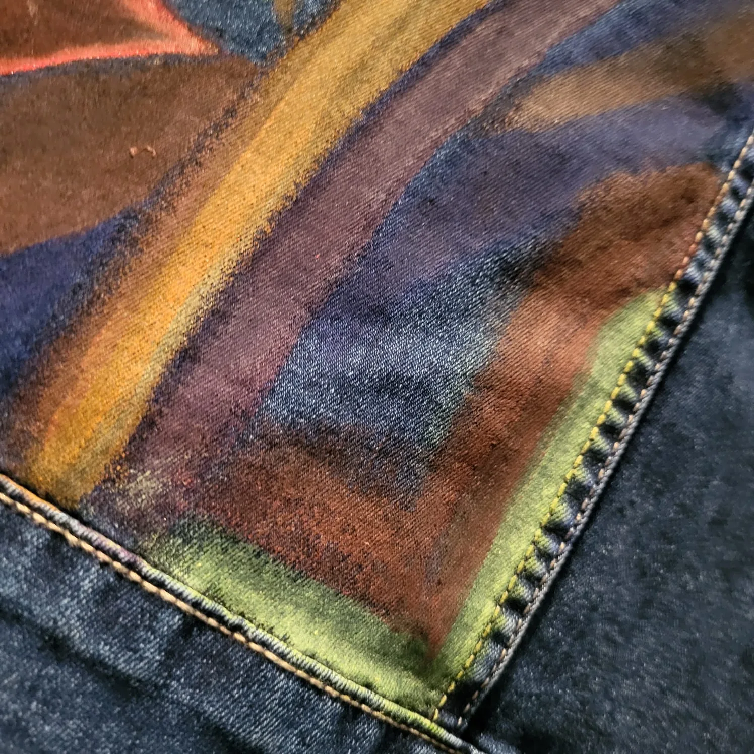 Giubbino in jeans tessuto Denim elasticizzato con soggetto occhio astratto dipinto a mano sulla parte dietro stile Pop Art