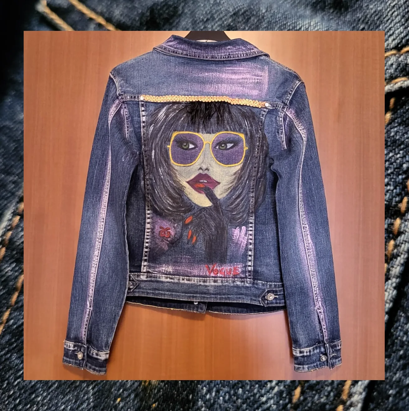 Giubbino in jeans con dipinto a mano soggetto viso donna con occhiali VINTAGE sulla parte dietro