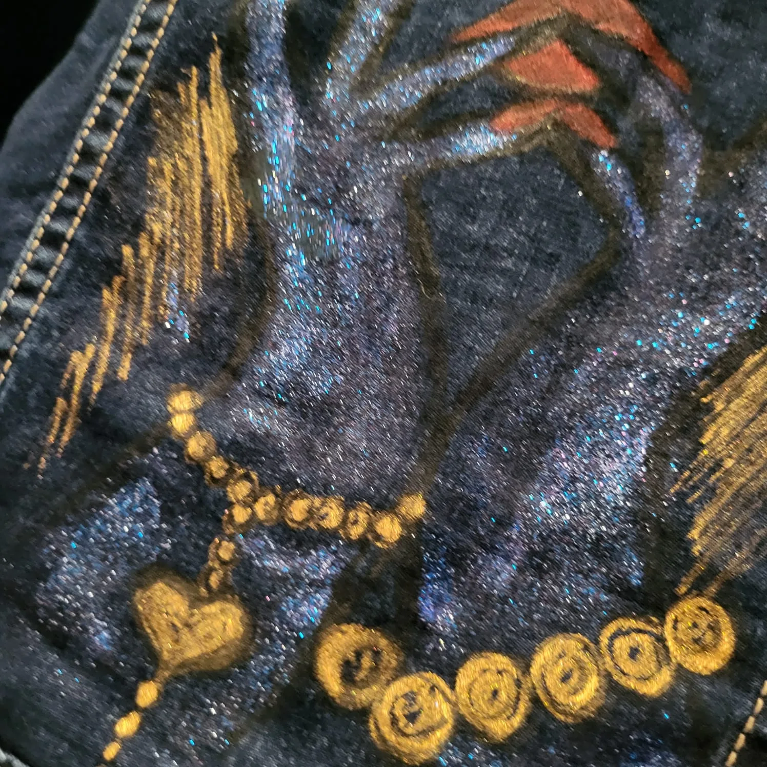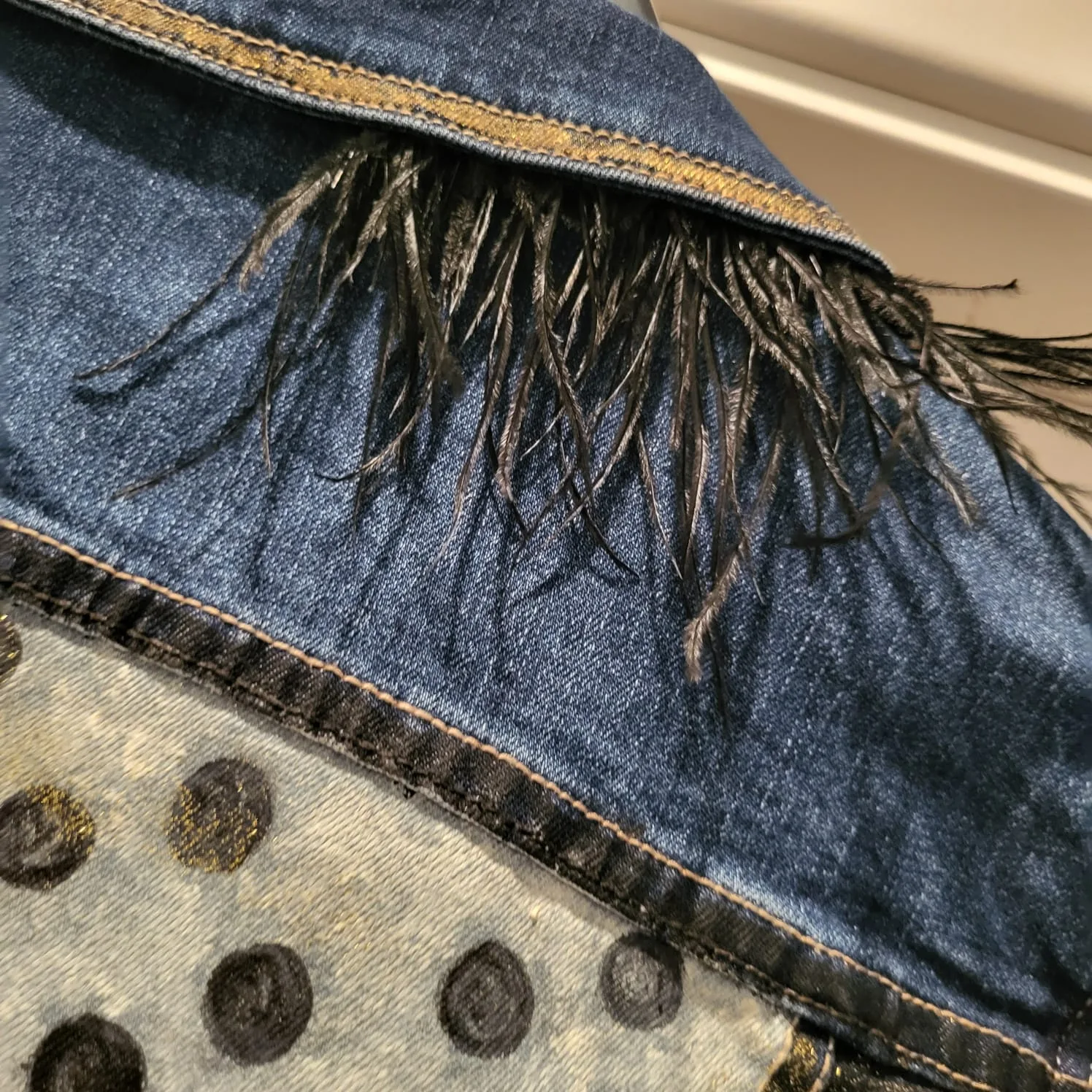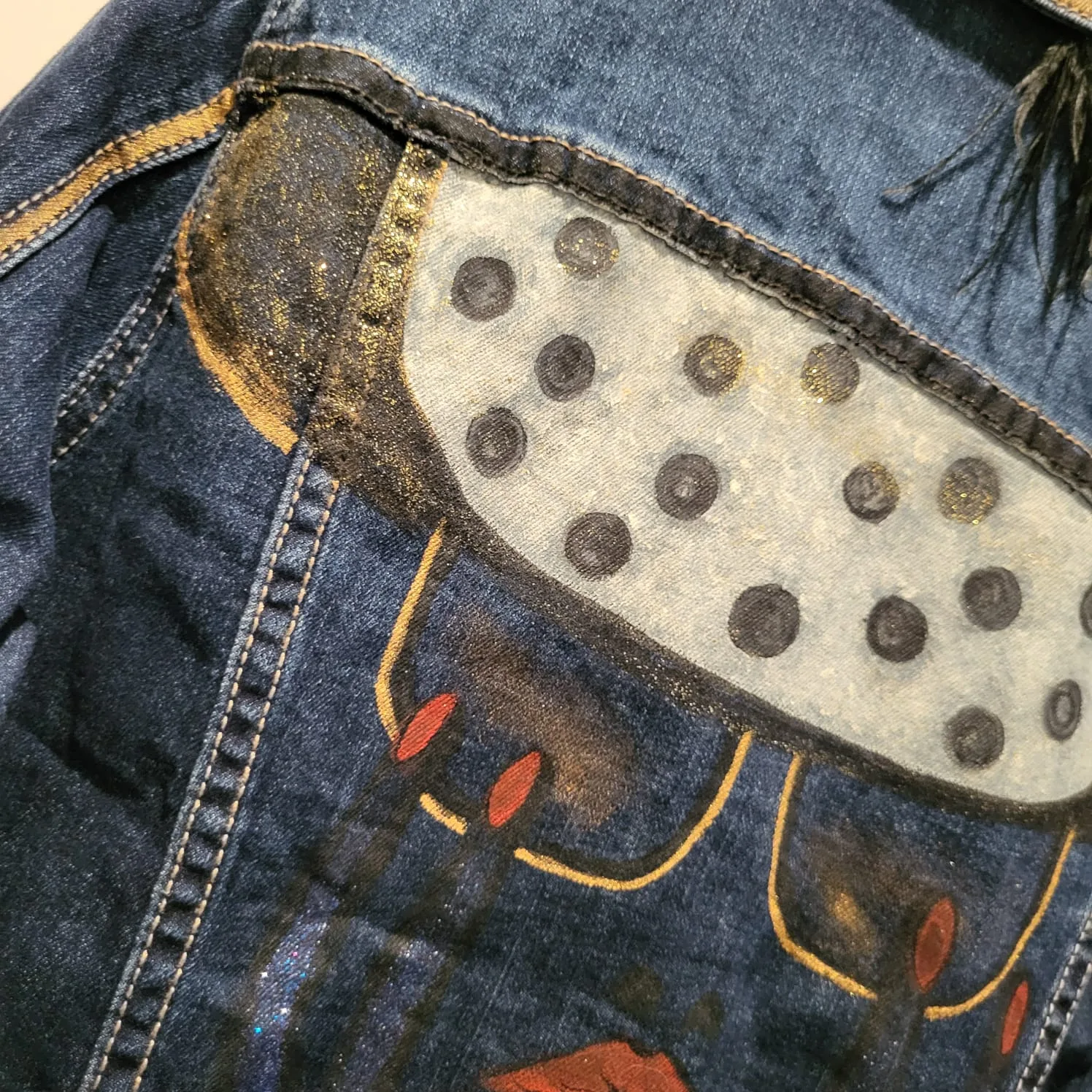 Giubbino in jeans con dipinto a mano soggetto viso stilizzato con occhiali e cappello a falda larga a pois sulla parte dietro