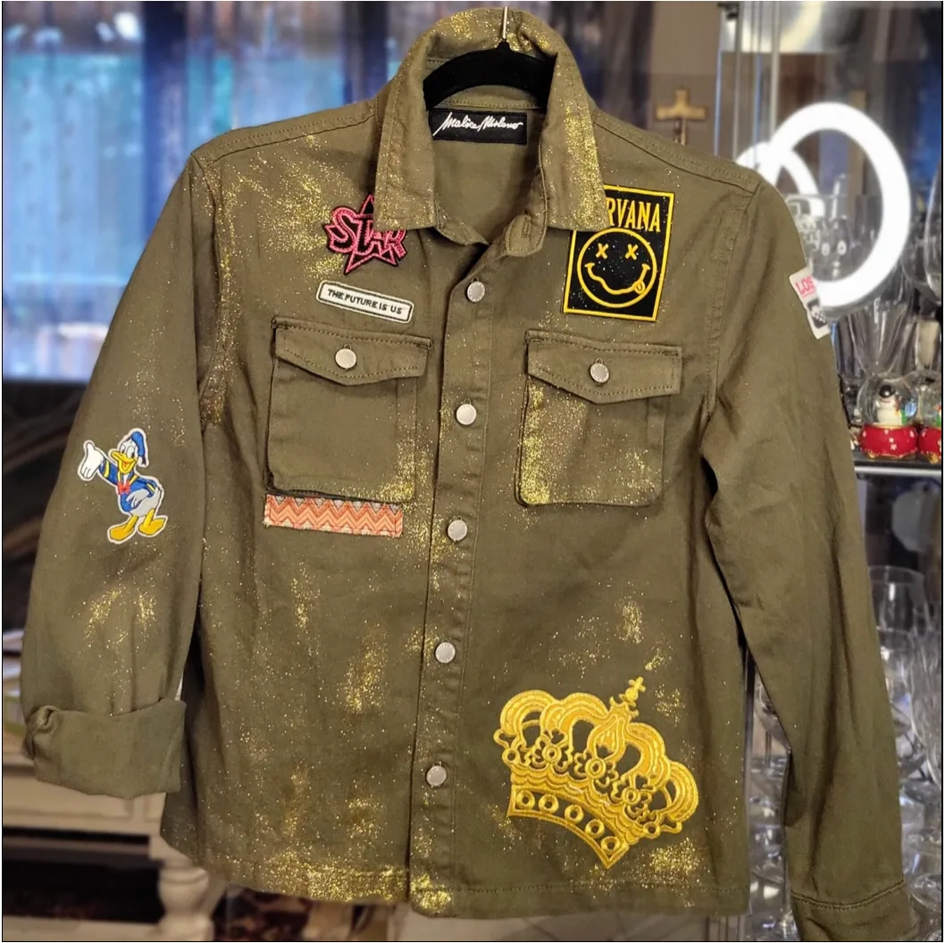 Giacca verde militare in cotone con inserti e toppe cucite – decorata a mano